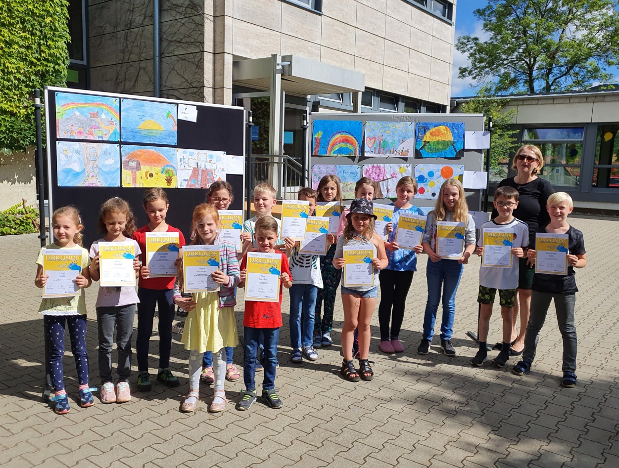 Am Dienstag fanden im Pausenhof der Schule, Ehrungen in den verschiedensten Disziplinen statt. Zunächst wurde die Preisverleihung für den alljährlichen Malwettbewerb der Volksbank vorgenommen. Die Kinder der Jahrgangsstufen 1 bis 4 hatten ihre Kunstwerke zum Thema „Was ist schön?“ eingereicht. Die drei besten Bilder aus den einzelnen Jahrgangsstufen wurden präsentiert und die Gewinner durften sich ein kleines Geschenk aussuchen. Eine besondere Ehre wurde Romy Lange aus der 1.Klasse zuteil: Ihr Bild wird im neuen Volksbank-Kalender abgedruckt. Als nächstes wurden , wie jedes Jahr, die zwei fleißigsten Leser der Klassen geehrt. Punkte konnten wieder über das ANTOLIN-Programm gesammelt werden. Die „Leseratten“ erhielten eine ANTOLIN- Urkunde und Buchgutscheine als Belohnung. Natürlich durfte bei den Ehrungen auch die sportliche Leistung nicht fehlen: